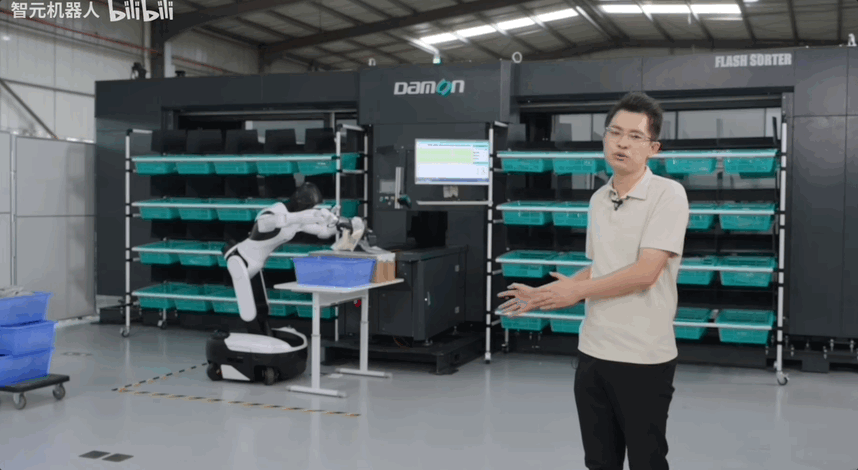 在物流分拣场景中,精灵 G2 已被用于包裹供包上料环节,能够有效抓取各种尺寸、形状和材质的包裹。当前波次的上料任务完成前,另一台精灵 G2 通过自主导航,迅速将后续物料运送至缓存区,强大的移动能力和良好的通过性使其能够适配 95% 以上的工厂地面。