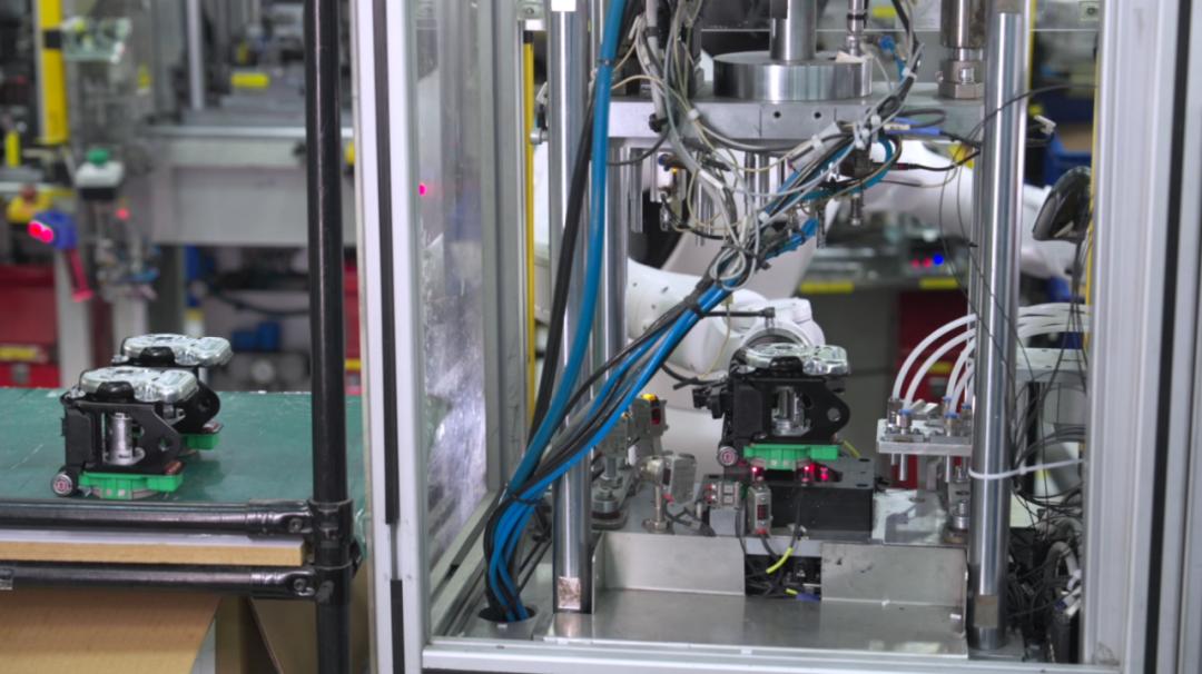 图注:智元精灵 G2 正将汽车安全带锁芯送入压紧机