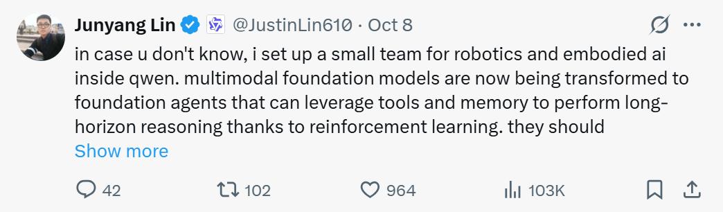 10 月 8 日,阿里通义千问技术负责人林俊旸在社交平台发文称,团队已在 Qwen 内部成立具身智能专项小组。