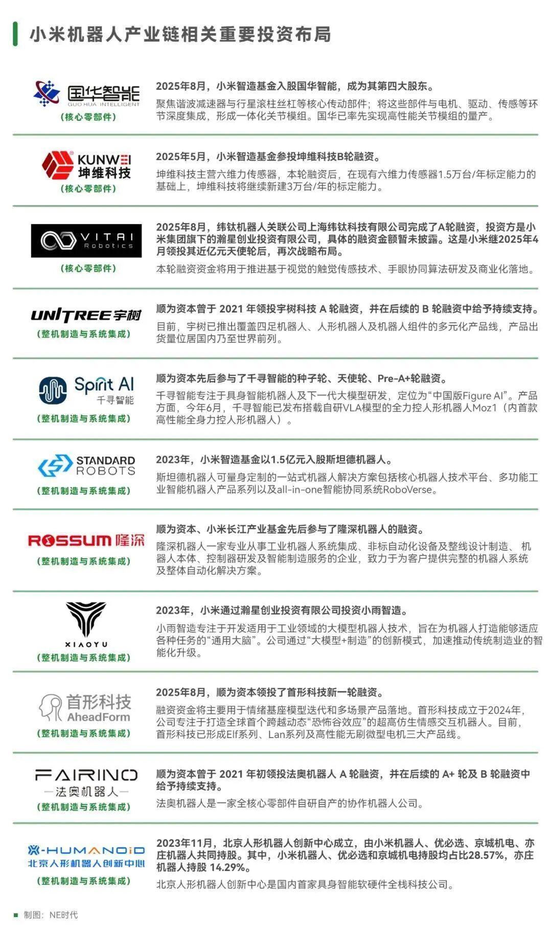 与此同时,小米通过智造基金、长江产业基金、顺为资本等机构构建具身智能投资网络,累计投资近 50 家企业,金额超 150 亿元,覆盖核心零部件、整机系统与应用场景。