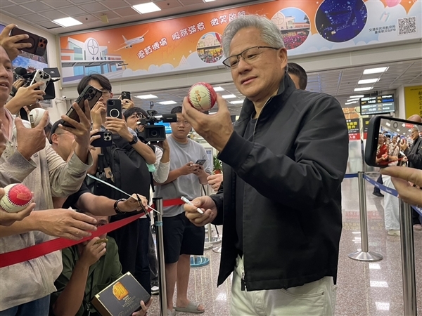 黄仁勋的专机于下午2时17分降落,落地后他随即以中英文向媒体和民众问好,并接受约6分钟的媒体采访,随后为现场守候的大批民众签名及合影。