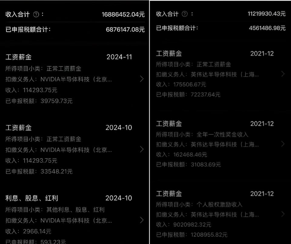 社交媒体上用户分享的疑似英伟达员工个税申报信息,仅供参考
