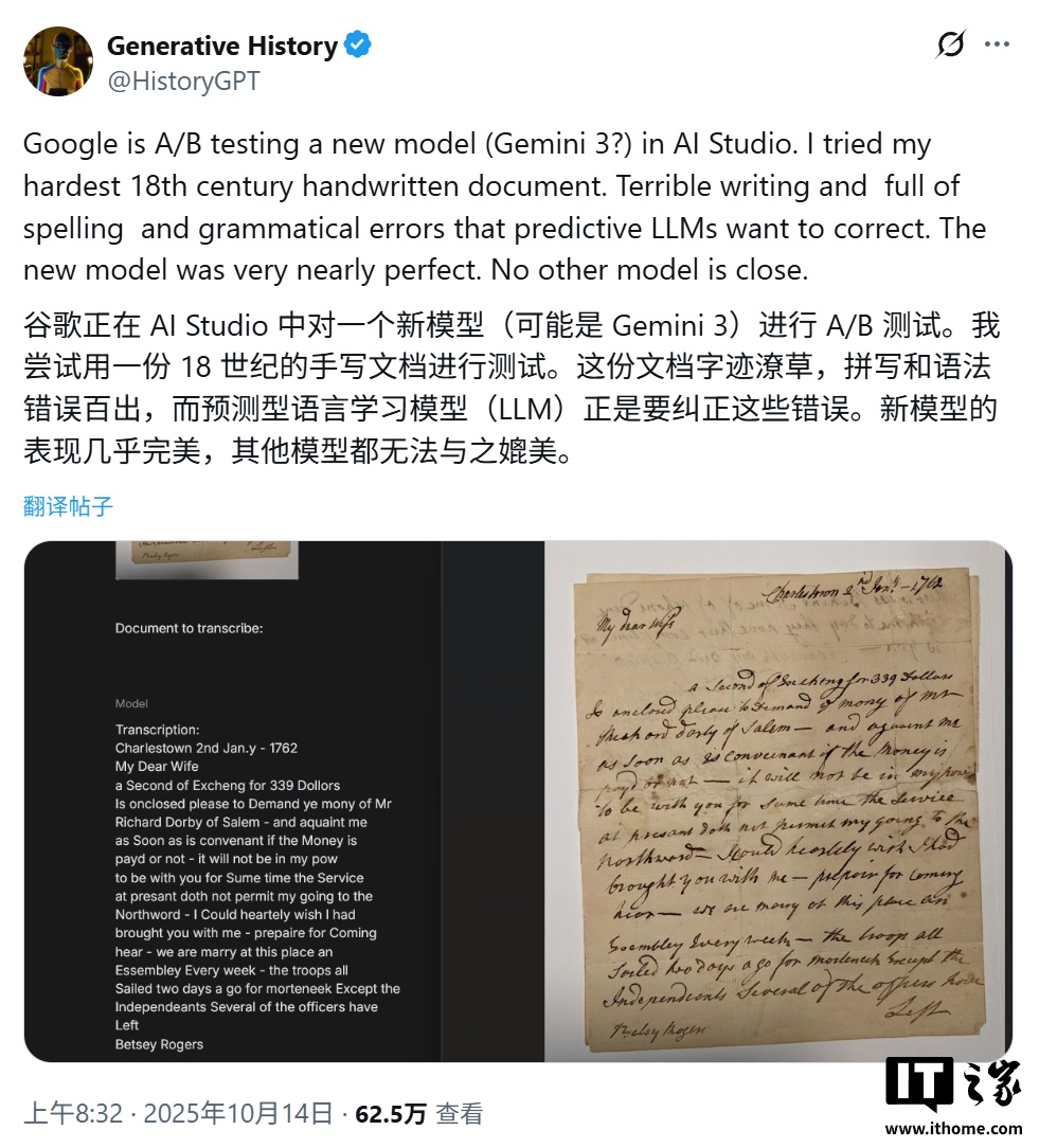 IT之家 11 月 16 日消息,科技媒体 golem 昨日(11 月 15 日)发布博文,报道称谷歌通过其 AI Studio 平台,正测试一款尚未命名的 AI 模型,在破译难以辨认的历史手稿方面已接近人类专家的水平。