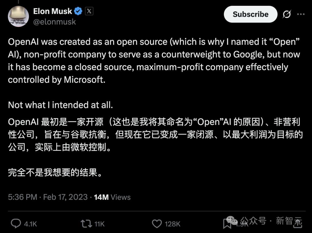 他在2023年2月17日的一篇推文中,愤怒指责OpenAI已经由一家开源的非营利性公司,变成了一家闭源的、受微软控制、追求利润最大化的公司,并称其背离了自己的初衷。