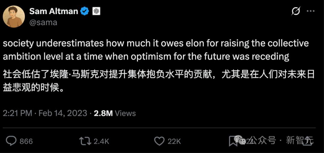 前面提到奥特曼发布的那条称赞马斯克的推文,就是发生在马斯克公开批评OpenAI商业化转向的背景之下,因此被外界普遍解读为奥特曼向马斯克伸出橄榄枝,重演二人早年的互动模式。