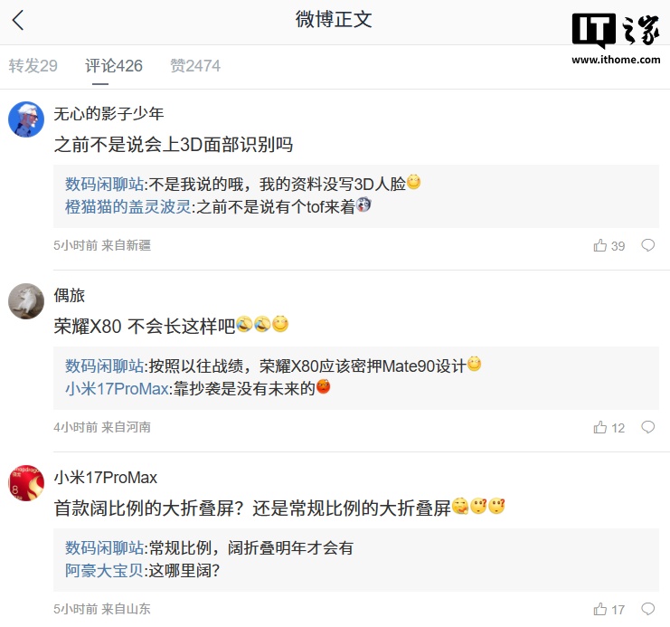 博主还在评论区回复了部分网友的问题:针对 Mate X7 为何没有 3D 人脸识别,他表示:“我的资料没写 3D 人脸。”针对荣耀 X80 的外观是否会和 Mate X7 相似,他称:“按照以往战绩,荣耀 X80 应该密押 Mate 90 设计。”