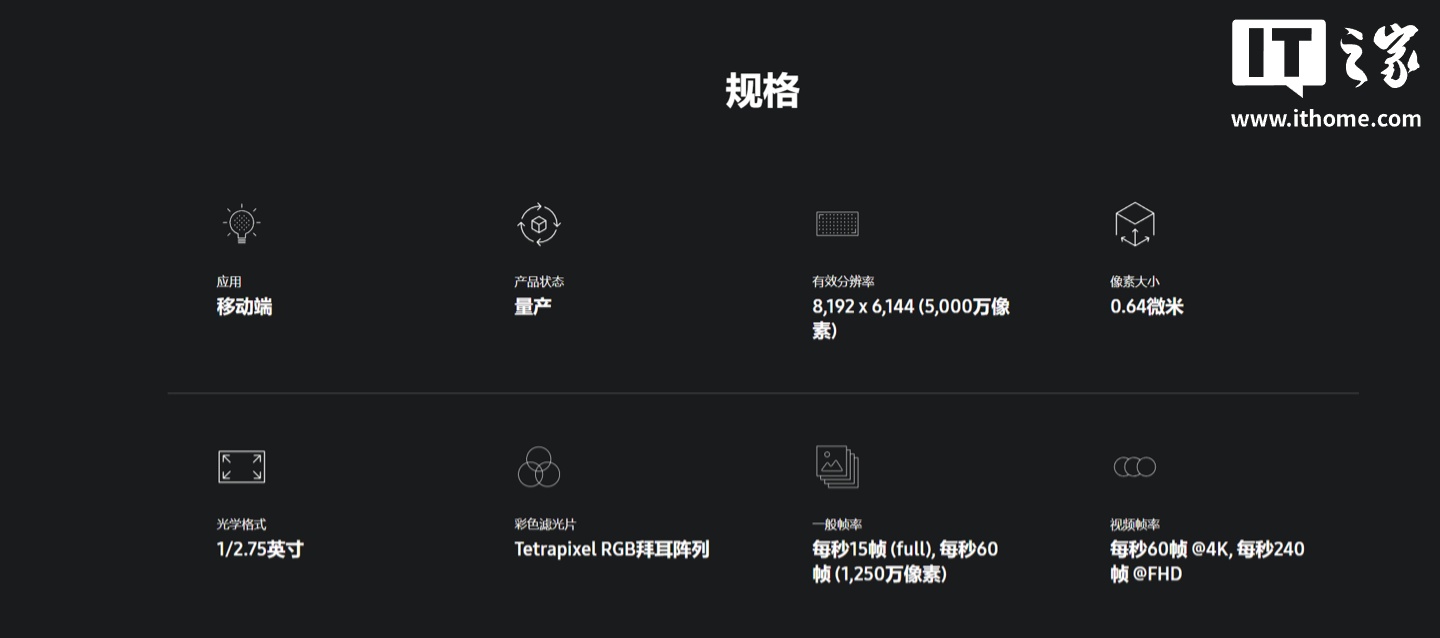 IT之家注:三星 ISOCELL JN5 传感器发布于 2024 年下半年,尺寸为 1/2.74 英寸,采用四拜耳 QPD 技术,单像素大小约为 0.64μm,最大输出像素 8192*6144,约 5000 万像素,相比上代产品 JN1 主要新增硬件 Remosaic ISZ 变焦功能,可为长焦相机提供更高画质。