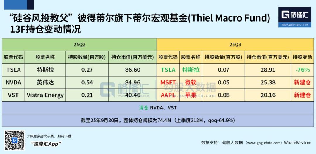 更关键的是,他没离开科技圈,只是换了赛道:清仓英伟达的同时,新建仓微软(4.9万股)和苹果(7.9181万股),砍了76%特斯拉。