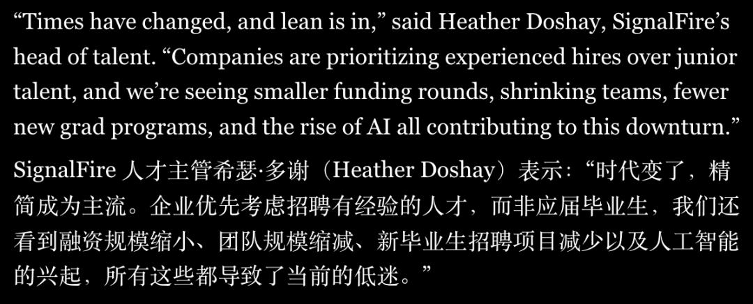 招聘专家海瑟·多谢(Heather Doshay)认为:AI正在做以前实习生和职场新人做的事。现在你只需招一个有经验的人,再给他配备AI工具,就能同时产出他自己和一个初级员工的工作成果,而且不需要额外支出。