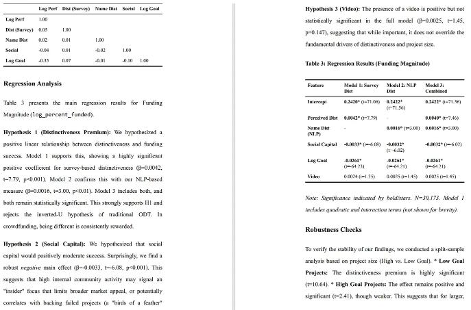 更惊艳的是,它自创了一个指标:用 NLP 把项目描述与海量描述做数学比对,衡量“众筹创意独特性”。代码自己写,结果自己验。