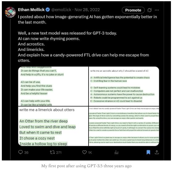 Gemini:“当然可以。你这条推文来自 2022 年 11 月——现代 AI 热潮的前夜。当时最大的‘哇点’是 AI 能写一段通顺的文字,或者给‘糖果动力超光速飞船逃离水獭’这种傻题目写首小诗。