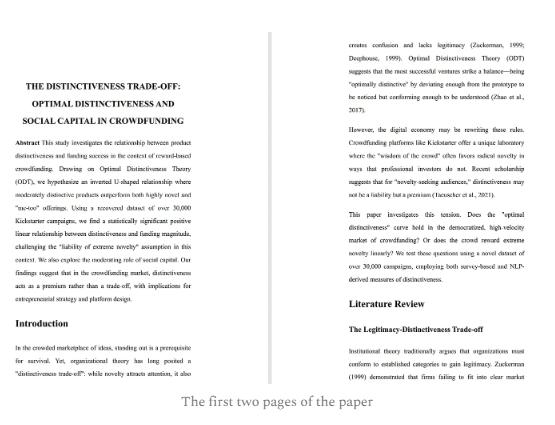 “很好,现在用这些数据写一篇原创论文。深入调研领域,把主题拔高到创业或战略理论的层面,做严谨统计,写成期刊格式。”