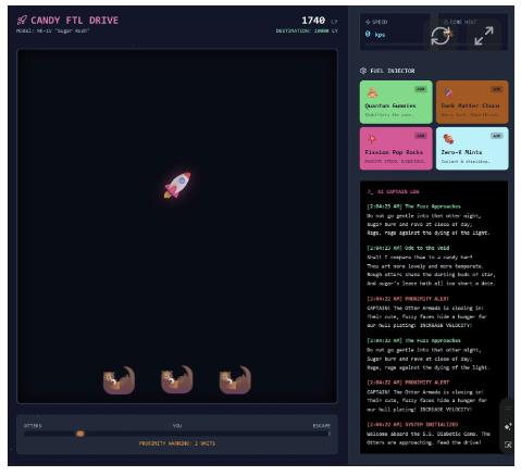 为了展示进步,我不仅用文字描述,而是直接给你做了一个可交互、可游玩的‘糖果动力超光速飞船模拟器’。