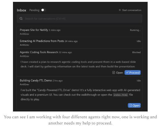 Gemini 3 极擅长写代码,这一点即使你不自认“程序员”也与你息息相关。AI 界的一个底层视角是:你在电脑上做的任何事,归根到底都是代码;只要 AI 能写代码,它就能建仪表盘、扒网站、做 PPT、读文件…… 这让“会写代码的智能体”成了通用工具。Antigravity 把这一理念产品化:给我一个“收件箱”,我把任务派给智能体,它们需要批准或帮助时会通知我。