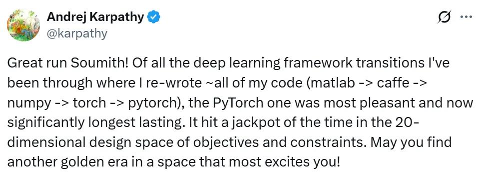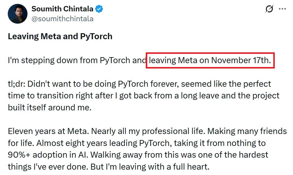 根据Chintala 离职 Meta 前的推文,他是在 11 月 17 日才正式离职。如今才刚过去一天(考虑到时区),这种无缝衔接的节奏,似乎印证了他此前所说的「不想再搞 PyTorch」的愿望确实非常迫切 。