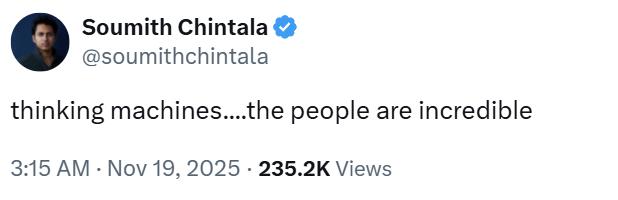 刚刚,才离开 Meta 不久的 Soumith Chintala 发布了一条推文,盛赞 Thinking Machines Lab(以下简称 TML)的人很了不起(incredible)。