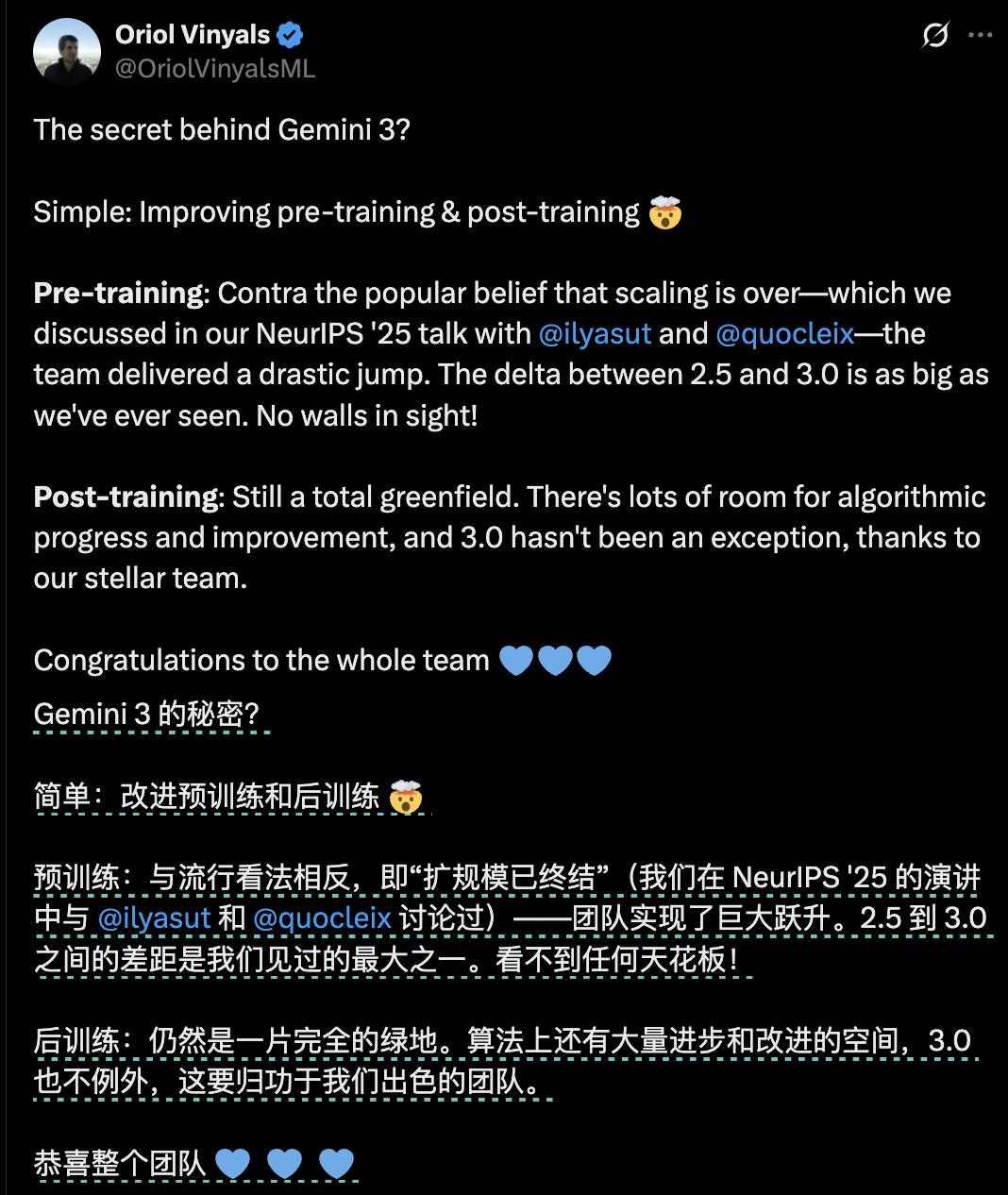 Oriol Vinyals,Google DeepMind的VP of Research、Deep Learning Lead和Gemini项目的联合负责人,在Gemini 3发布后发推文说:“Gemini 3的秘密?简单:改进预训练和后训练。后训练仍然是一片完全的绿地。算法上还有大量进步和改进的空间”。他特别强调:“与流行看法相反,即‘扩规模已终结’——团队实现了巨大跃升。2.5到3.0之间的差距是我们见过的最大之一。看不到任何天花板!”