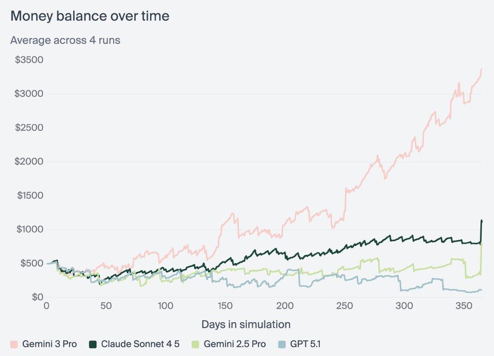 这个测试在今年相当火爆,因为在Benchmark逐渐饱和的当下,和Agen落地的困难下,各个公司更看重模型能否在长时间、多步骤、需要持续状态跟踪的复杂任务中保持性能。而Gemini 3实现的$5,478.16平均净值,相比GPT-5.1的$1,473.43和Gemini 2.5 Pro的$573.64提升也是断崖式领先。