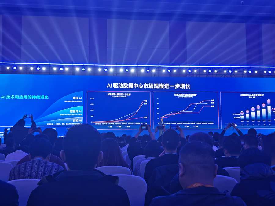 如今,每个月中国电商市场有超过1.25万亿营业额;各类视频平台每个月的视频播放次数已经突破10万亿次;全球AI大模型每个月产生超过一千万亿的Token。同时,在今年第三季度中国公司所贡献的开源大模型,全球下载量达到世界第一,综合能力也达到领先地位。未来五年全球支撑AI所产生的电力将增加3.5倍。通用工作负载也将翻番。