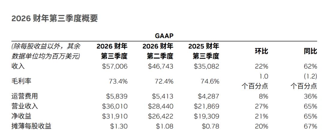 2026财年第三季度,其营收冲上570亿美元,同比激增62%;经调整净利润达319亿美元,同比增长65%——两大核心指标均大幅超越华尔街预期,在“AI泡沫论”四起的舆论场中,给出了最有力的回击。