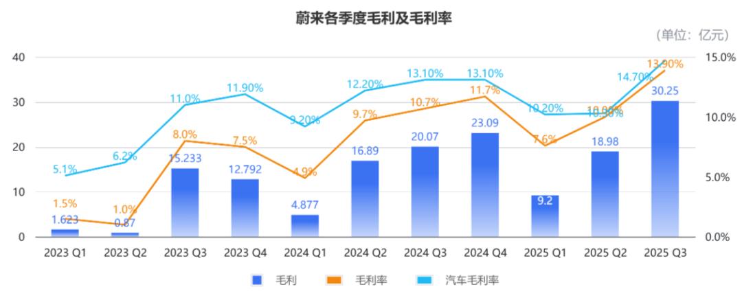 接下来,通往盈利的第二个关键,就是毛利了。从蔚来三季度的毛利率上,确实已经看到了公司盈利能力的提高。