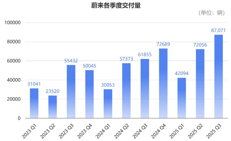 今年第三季度,蔚来交付量为87071辆车,同比增长40.8%,环比增长20.8%。
