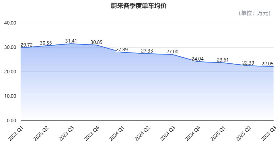 算下来,蔚来Q3单车均价约22.02万元,同比下滑18.3%,环比下滑了1.5%。