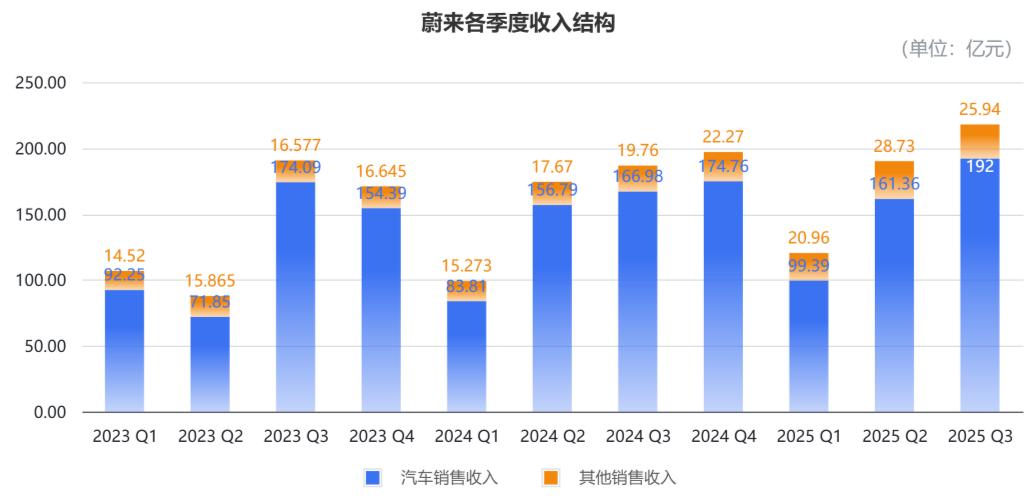 蔚来第三季度总营业收入为217.9亿元,同比增长16.7%,环比增长14.7%。