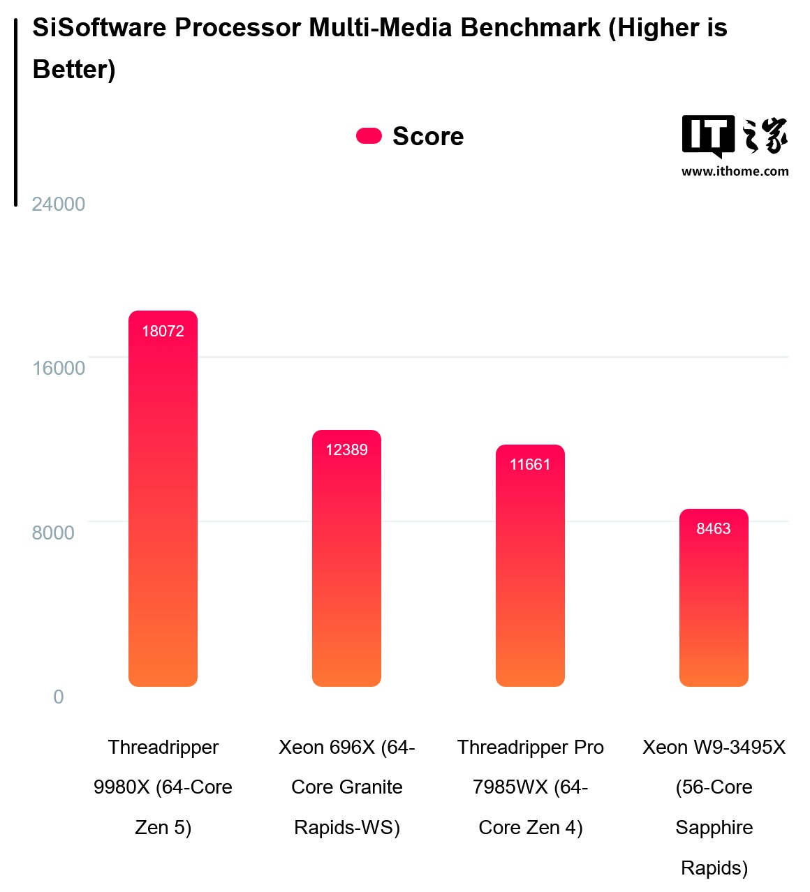尽管自家代际提升明显,但在与竞争对手 AMD 的横向对比中,Xeon 696X 仍面临压力。测试显示,AMD 基于 Zen 4 架构的 64 核心 Threadripper Pro 7985WX 在综合 CPU 评分上略胜一筹,领先幅度约为 20%。