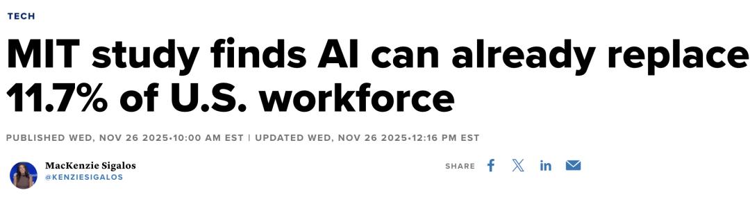 而来自MIT的研究发现,AI已经能取代11.7%的美国劳动力。