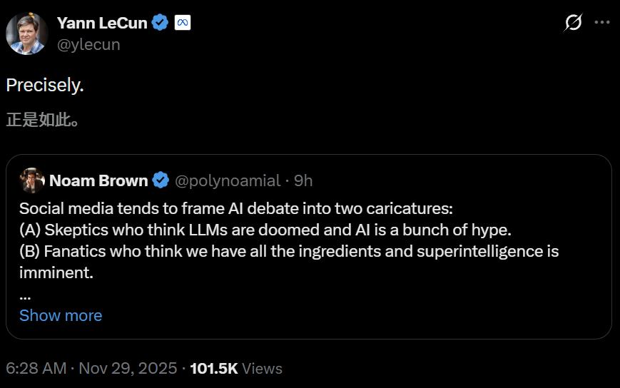 对此,图灵奖得主Yann LeCun表示完全赞同。