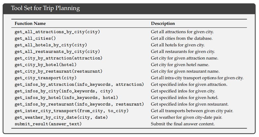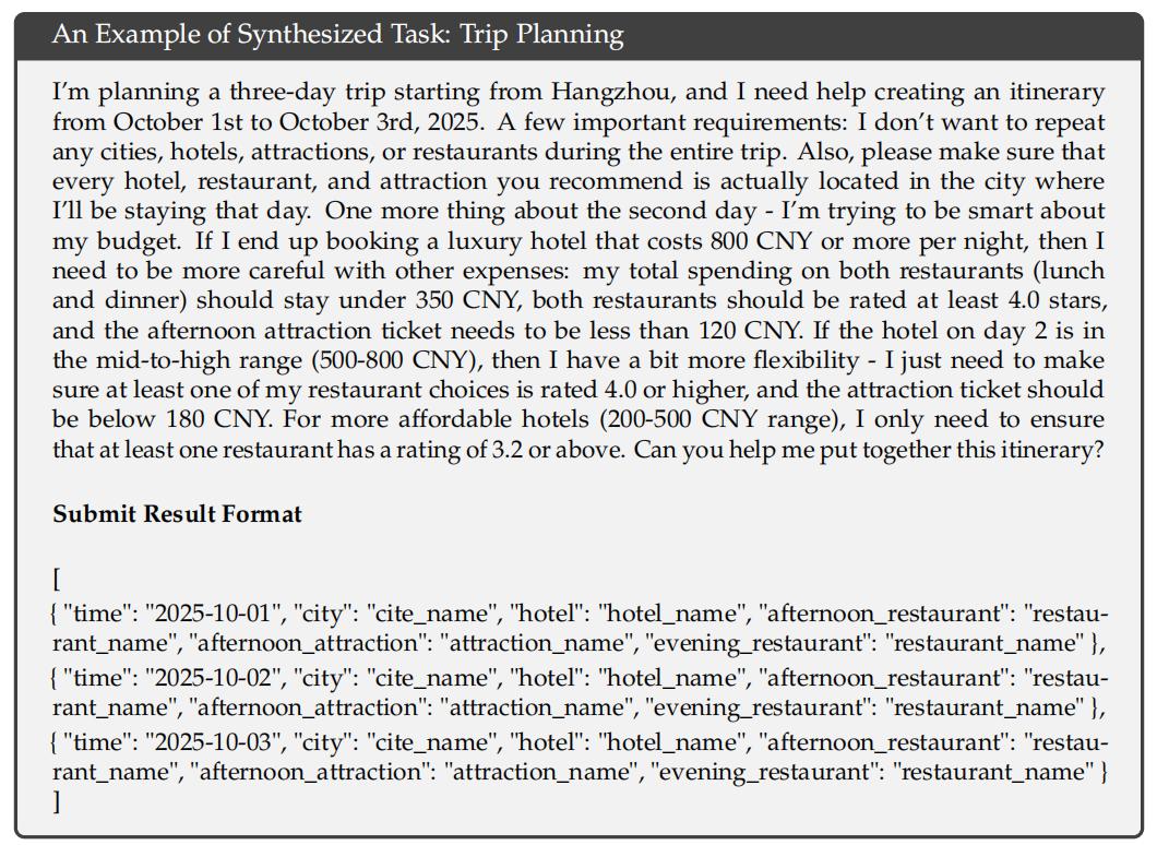 以旅行规划为例,模型需要在满足各种约束条件下规划三天的行程,包括不重复城市、根据酒店价格调整餐厅和景点预算等复杂逻辑。