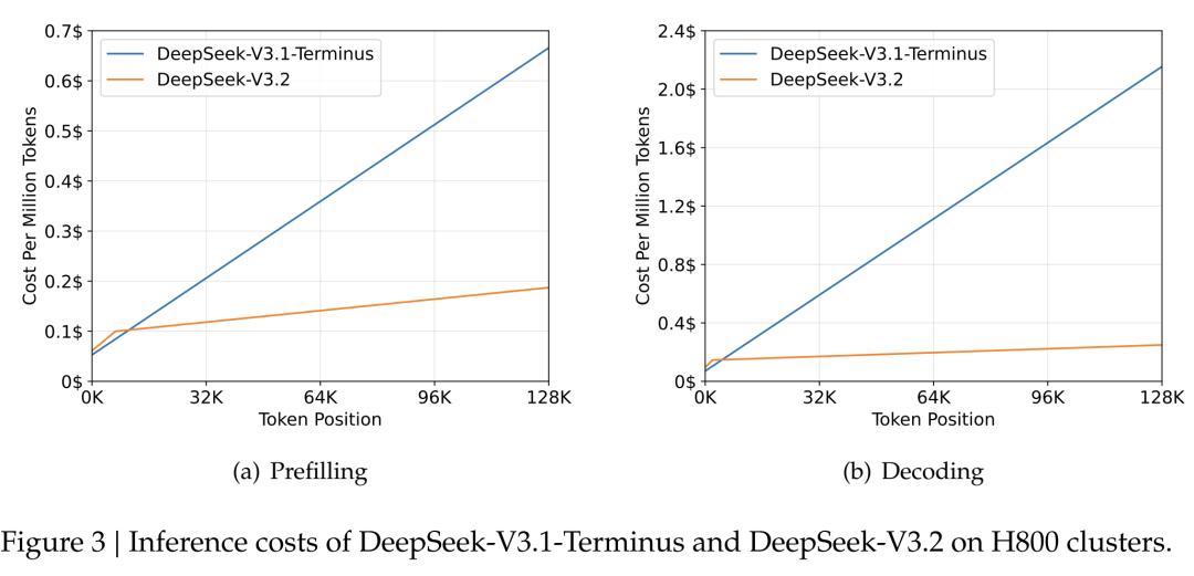 在128k长度的序列上,DeepSeek-V3.2的推理成本比V3.1-Terminus降低了好几倍。