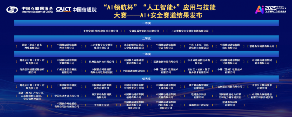 为深入贯彻落实中央经济工作会议关于“以科技创新引领新质生产力发展,开展‘人工智能+’行动,培育未来产业”的重要精神,中国互联网协会举办首届“AI领航杯”“人工智能+”应用与技能大赛,中国信息通信研究院承办其中的“AI+安全”赛道。经过初赛、决赛及全国总决赛的激烈角逐,最终评定出获奖项目48个。其中,一等奖项目3个;二等奖项目8个;三等奖项目15个;优秀奖项目22个。中国互联网协会副秘书长裴玮在论坛上公布了AI安全赛道获奖结果。