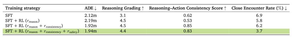 对此,该模型中的奖励函数不仅看重车辆是否开得安全,更看重模型嘴上说的推理逻辑与实际做出的驾驶动作是否吻合。