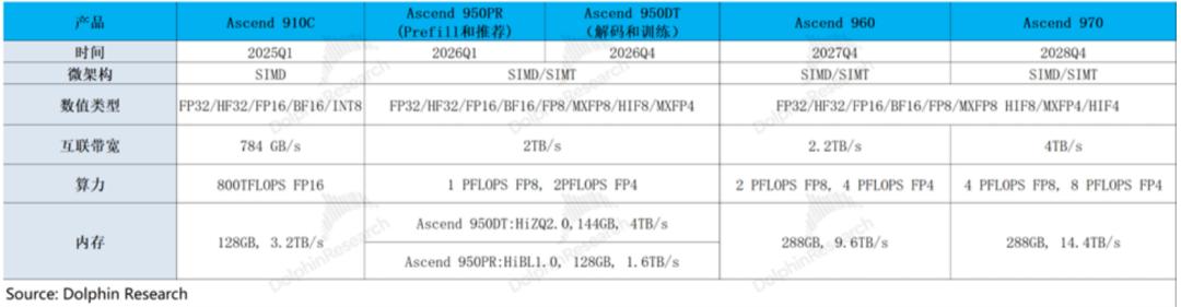 在路线图演进上能看到和H200竞争的,要等到华为下一代950芯片(适用于FP8)会是首款能用到训练上,同时内存配置、卡间互联和集群能力都比较强的国产芯片。