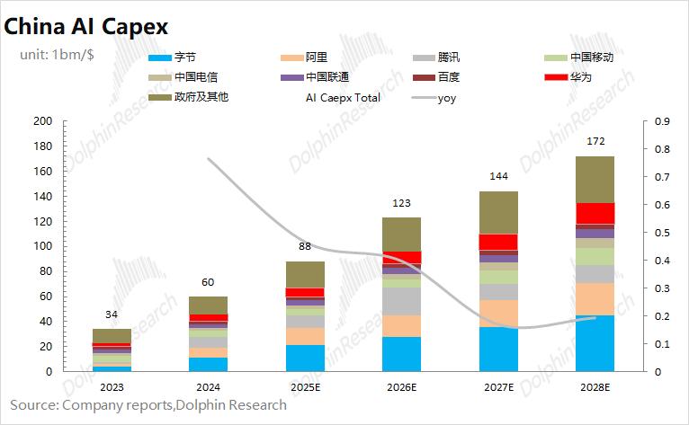 首先,海豚君将中国需要AI芯片卡的直接客户分为三类:互联网大厂(字节、腾讯、阿里、百度)、华为云、运营商及政企云(中国移动、中国联通、中国电信等)。