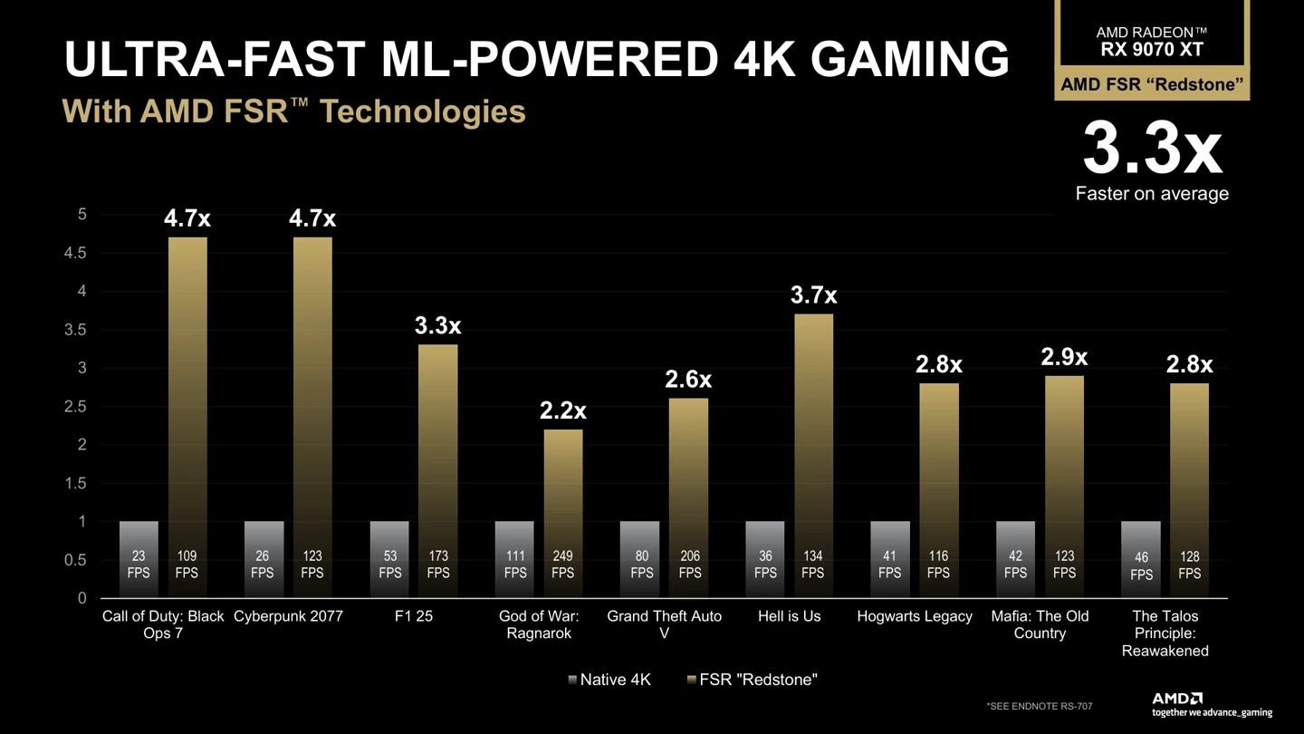 AMD 公布的性能对比显示,在开启 Redstone 技术后,4K 场景下的性能可比原生渲染提升 2 倍至最高 370% 不等。