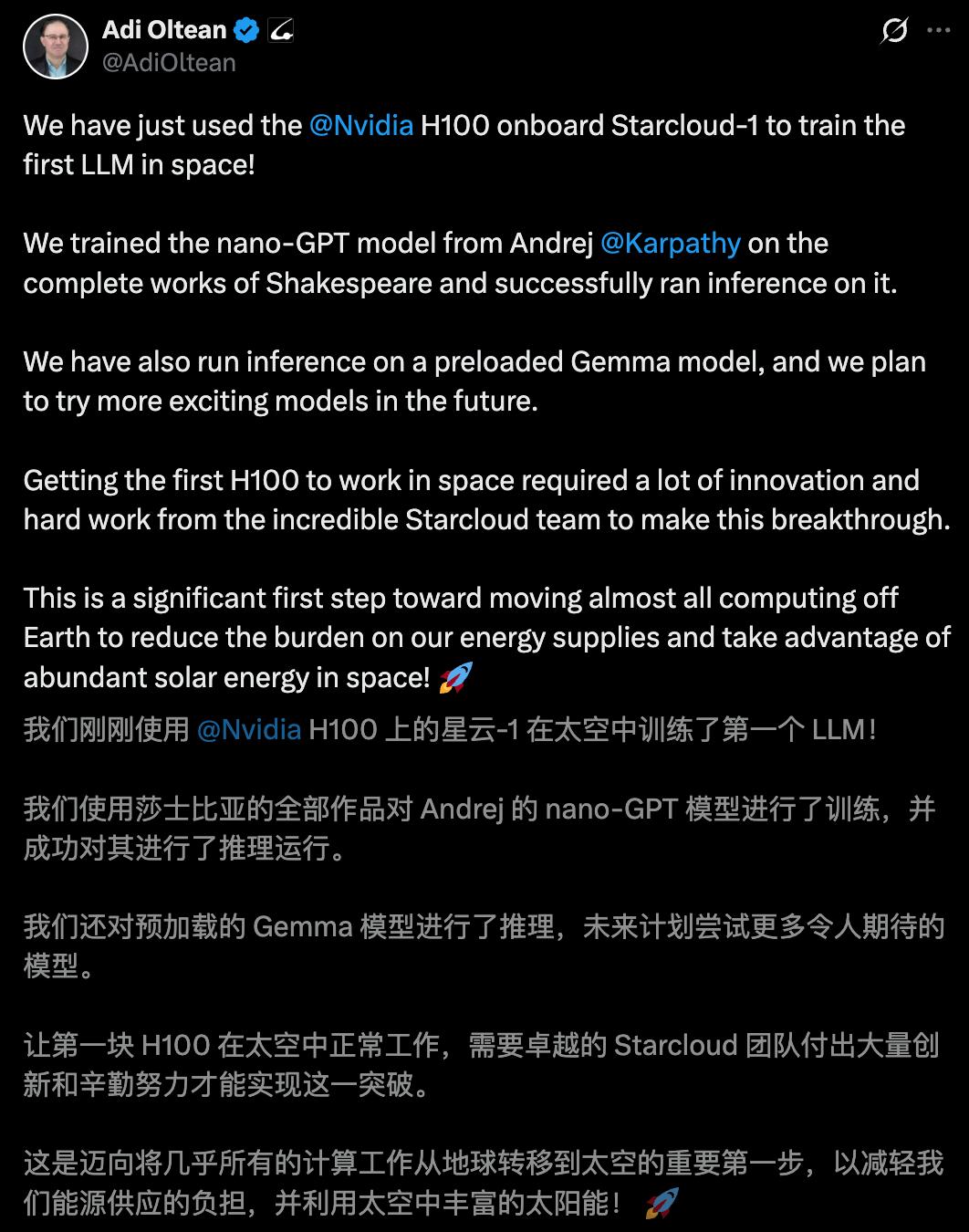 Karpathy本人激动表示,nanoGPT首个在太空进行训练和推理的模型,新征程,就此启航。