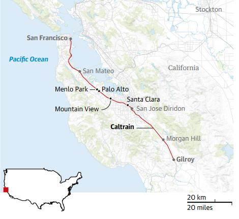 图:硅谷通勤列车路线图,沿途经过圣克拉拉、山景城、帕洛阿尔托、门洛帕克以及旧金山等城市