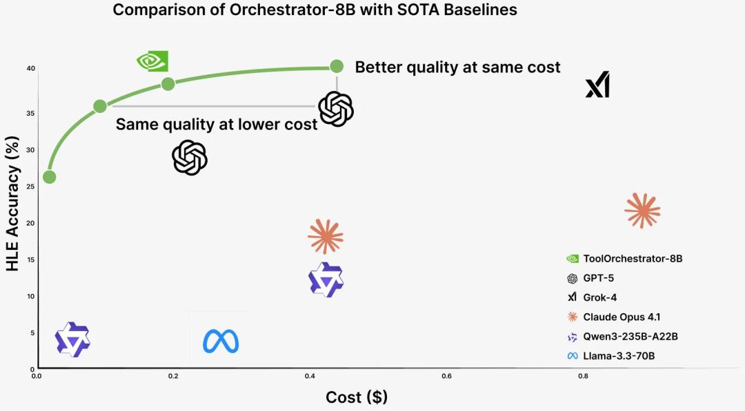 觉得大模型消耗的算力过大,英伟达推出的8B模型Orchestrator化身「拼好模」,通过组合工具降本增效,使用30%的预算,在HLE上拿下37.1%的成绩。