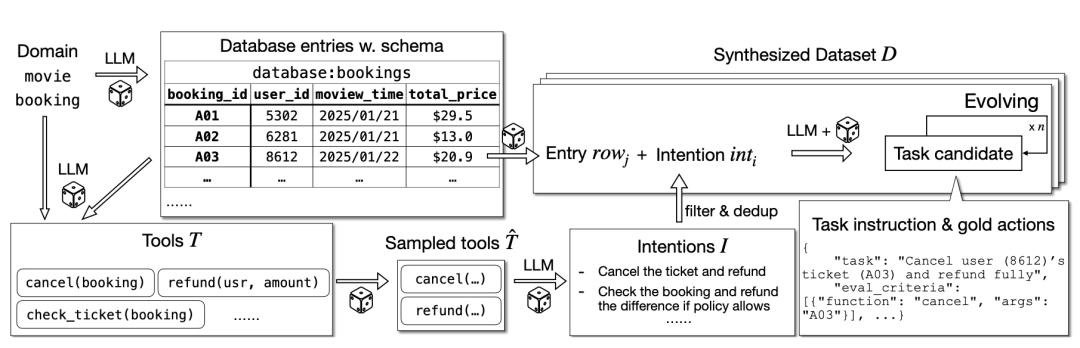 作为首个大规模、可验证的多轮工具调用合成数据集:ToolScale通过大模型自动构建10个领域(金融、医疗、航空等)的模拟环境(含数据库+工具API),再生成43万条含人工标记的最佳工具调用轨迹的任务。