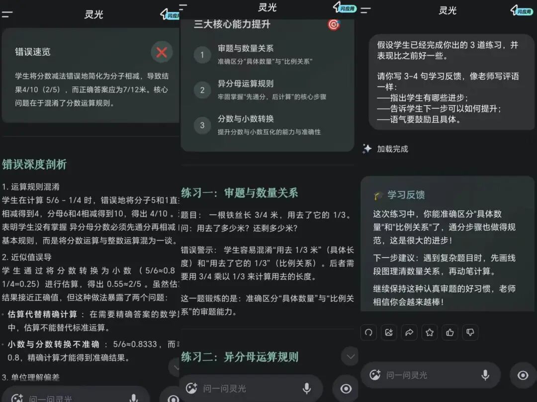 在第一步诊断中,三款助手延续了前面的水准:豆包能准确指出计算规则上的错误,千问会补充学生可能的直觉思维路径,灵光则把问题更系统地归类到通分、单位统一和数量关系理解等环节。