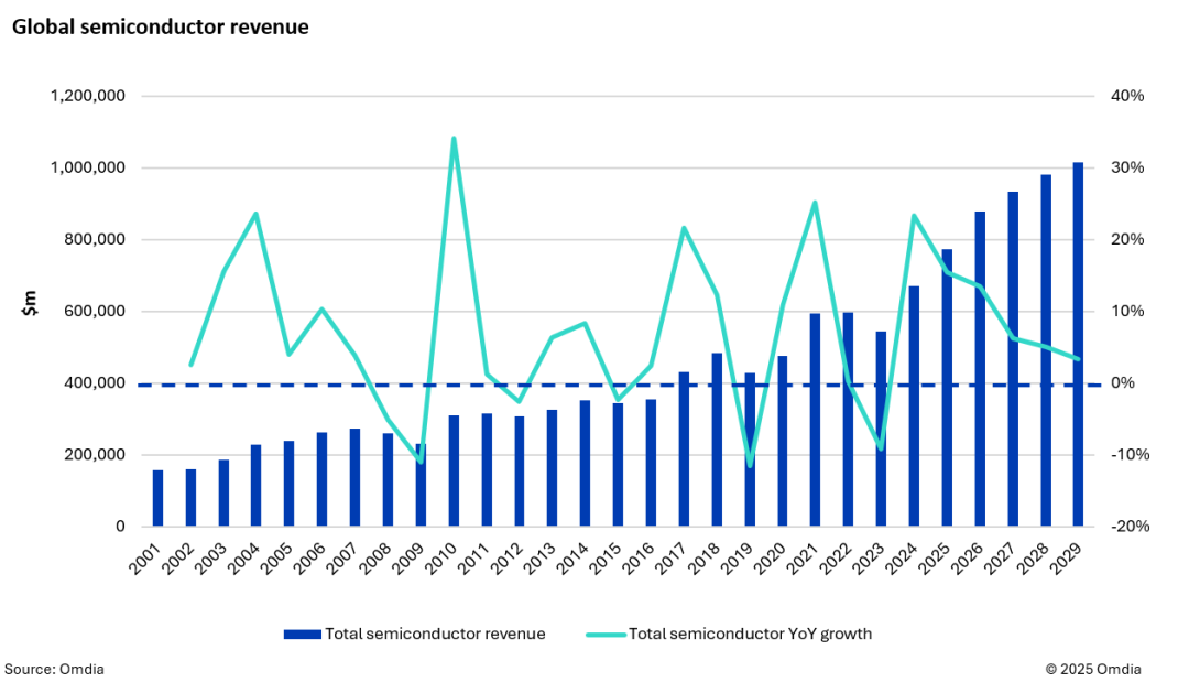 预测显示,2025年将迎来由AI驱动的第二轮增长周期,预计同比增长态势将贯穿整个预测区间(半导体市场总收入有望实现连续六年增长)。