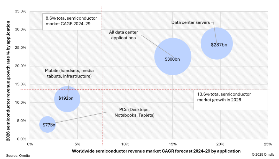 在AI技术驱动下,数据中心服务器成为半导体营收的主要驱动力,对 GPU、逻辑 ASSP/ASIC、DRAM(HBM)和电源管理芯片的需求显著增加。