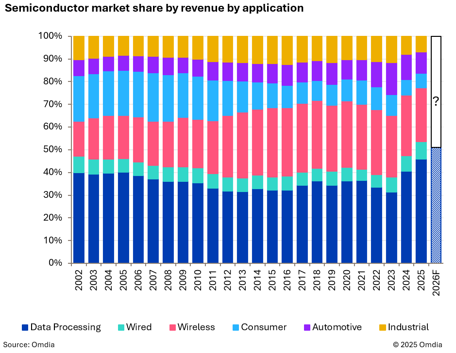 数据计算领域的营收在短短两年内实现翻倍增长,且目前未见放缓迹象。2025年该领域收入较2023年增加2000亿美元,其市场份额创历史新高,约占半导体总收入的46%。2026年,数据计算的占比是否会首次突破50%?