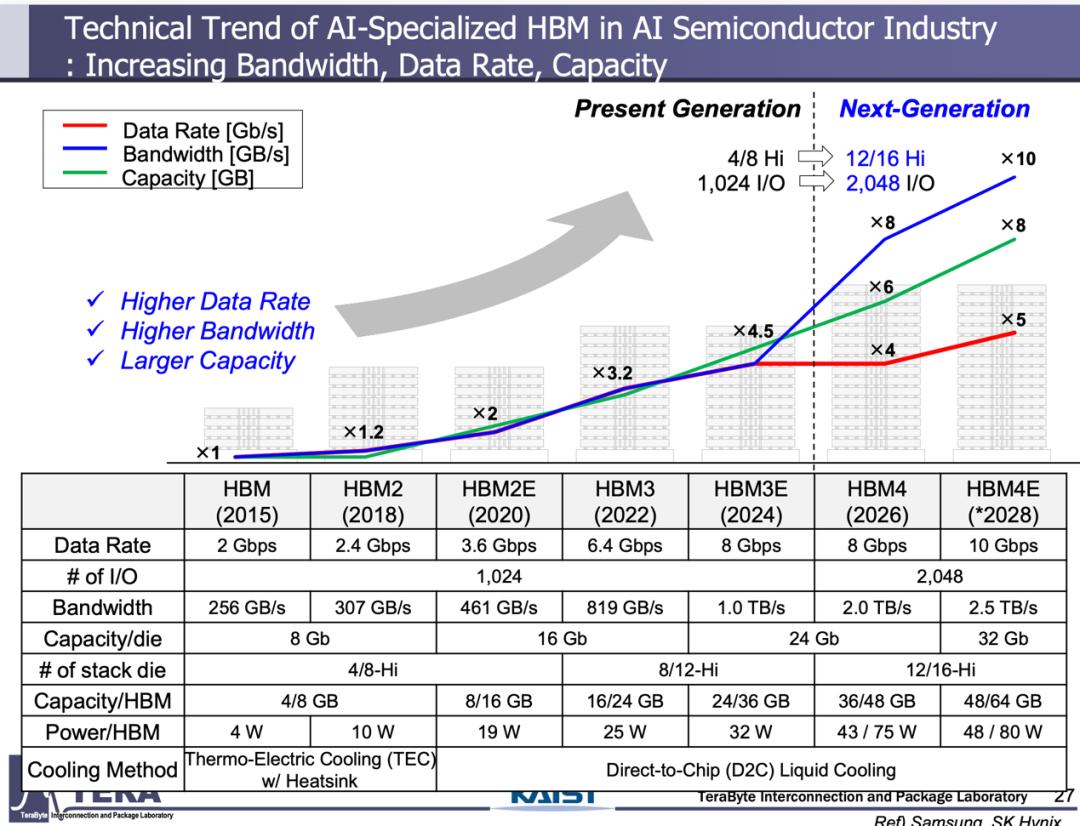 最近,韩国KAIST大学TERALAB实验室(韩国科学技术院tera字节互联与封装实验室)发布了一份371页的《HBM Roadmap Ver 1.7》,这份报告堪称HBM领域的“圣 经”——不仅详细拆解了当前HBM3/3E的技术细节,更画出了从2026年HBM4到2038年HBM8的完整发展蓝图。报告里的每一个参数、每一张架构图都在告诉我们:未来10年,AI能跑多快、算多准,很大程度上要看HBM能“送”多快。