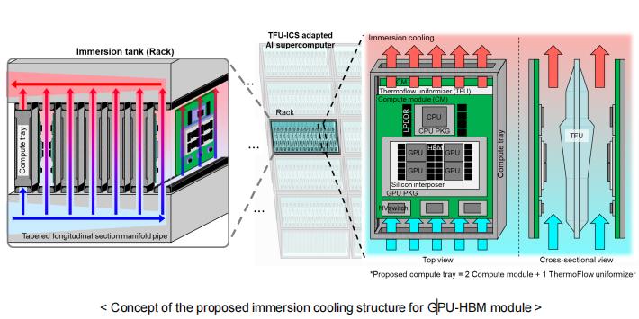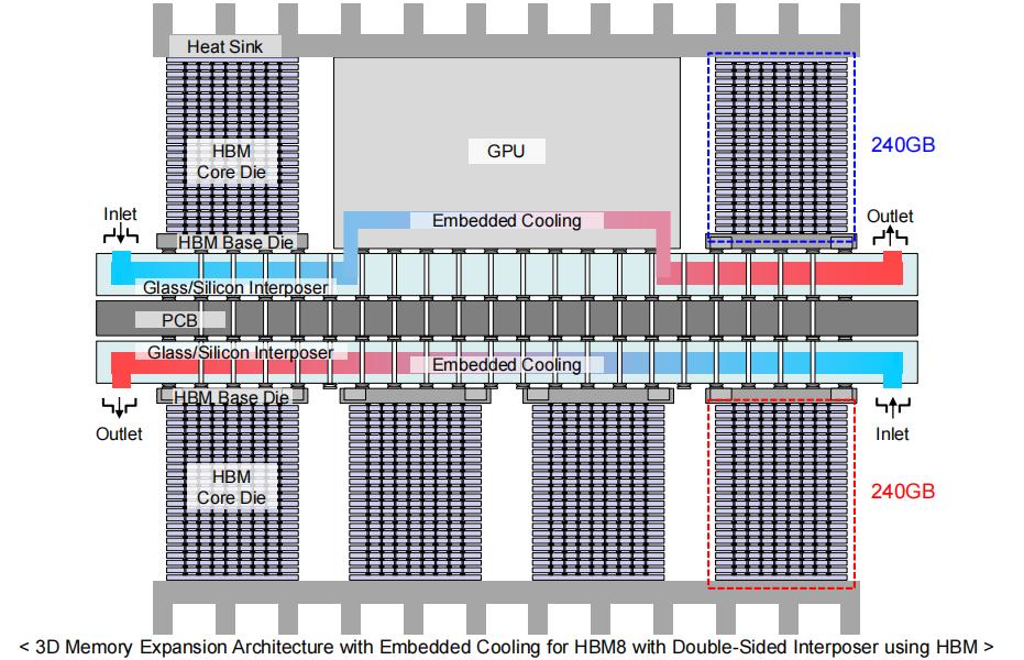 160W的功率,传统的浸没式冷却以应对集中化的高热量,无法满足稳定运行需求,HBM7采用“嵌入式冷却”——在Base Die和Core Die里直接刻出“微型水道”(直径50微米,比头发丝还细),让冷却液直接在芯片内部循环,热量能快速被带走(热传输线(TTL)和流体热沉(F-TSV)可以通过将冷却液从GPU循环到中介层和HBM,从而高效地冷却HBM模块。TTL可将HBM芯片内部的热量传递给流经F-TSV的流体)。