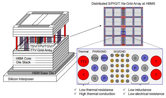 HBM4的TSV是“对称布局”——信号、电源、接地的孔混在一起,容易互相干扰;HBM5开始用“不对称布局”,把不同功能的孔分开,干扰减少40%;HBM8则用“同轴TSV”——像同轴电缆一样,中间是信号柱,外面套一层接地层,干扰再降30%,即使在32Gbps的高速下,信号也能稳定传输。
