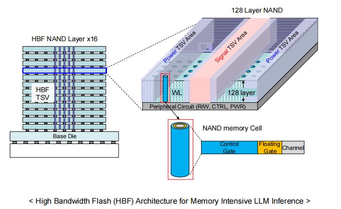 HBM7最关键的升级是“集成HBF(High Bandwidth Flash,高带宽闪存)”——HBF是128层的NAND闪存,相当于“大容量仓库”,单模块容量2TB(是HBM的10倍以上),每GB成本只有HBM的1/5。